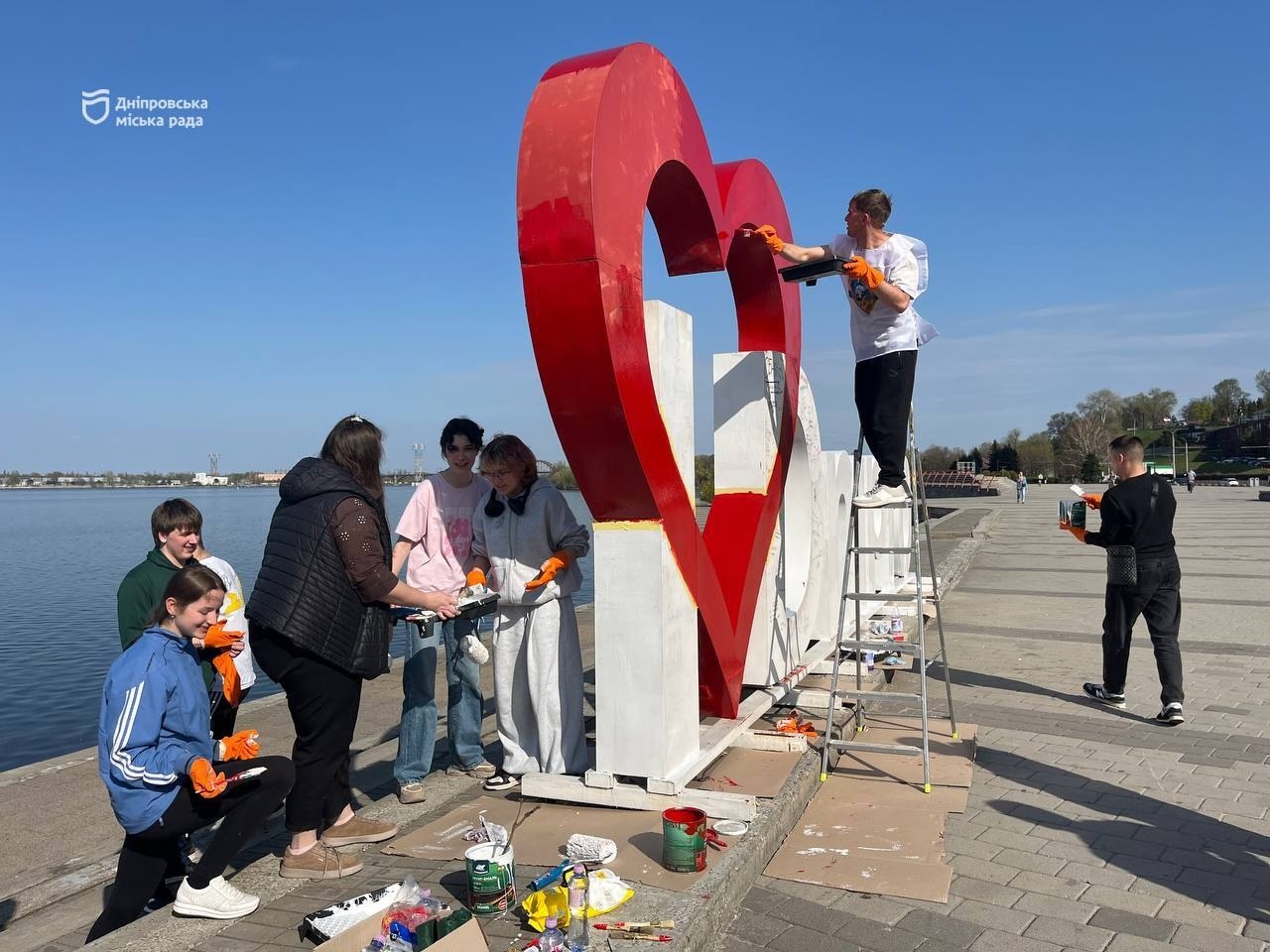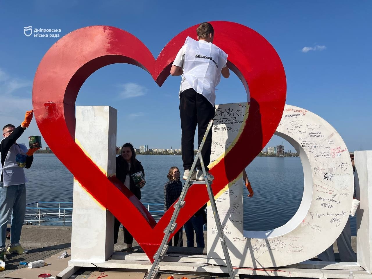 У Дніпрі активна молодь міста, студенти та волонтери об’єдналися для відновлення відомого артоб’єкта «I LOVE DNIPRO» на Січеславській Набережній. Учасники акції власноруч очистили інсталяцію від написів вандалів та пофарбували її, повернувши локації естетичний вигляд.