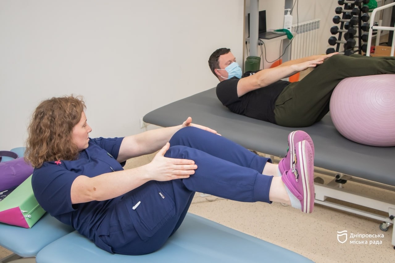«Станіслав прийшов до нас десь тиждень тому. У нього кила поперекового відділу хребта, через це було дуже сильне загострення болю, який віддавав у ногу. Біль був близько 6 за 10-бальною шкалою. Йому було важко сидіти, стояти, нахилятися вперед, навіть зігнути ліву ногу. Реабілітація буде тривалою. Зараз ми використовуємо нейродинамічні вправи, на розтяг, зміцнення. Вже бачимо результати — Станіслав швидко почав ходити, тримає рівно спину, хоча до цього не міг рівно стояти. Наші заняття, що починалися з 30–45 хвилин із частими відпочинками, тепер тривають півтори години. Це очевидний прогрес», — зазначила фізична терапевтка Олександра.