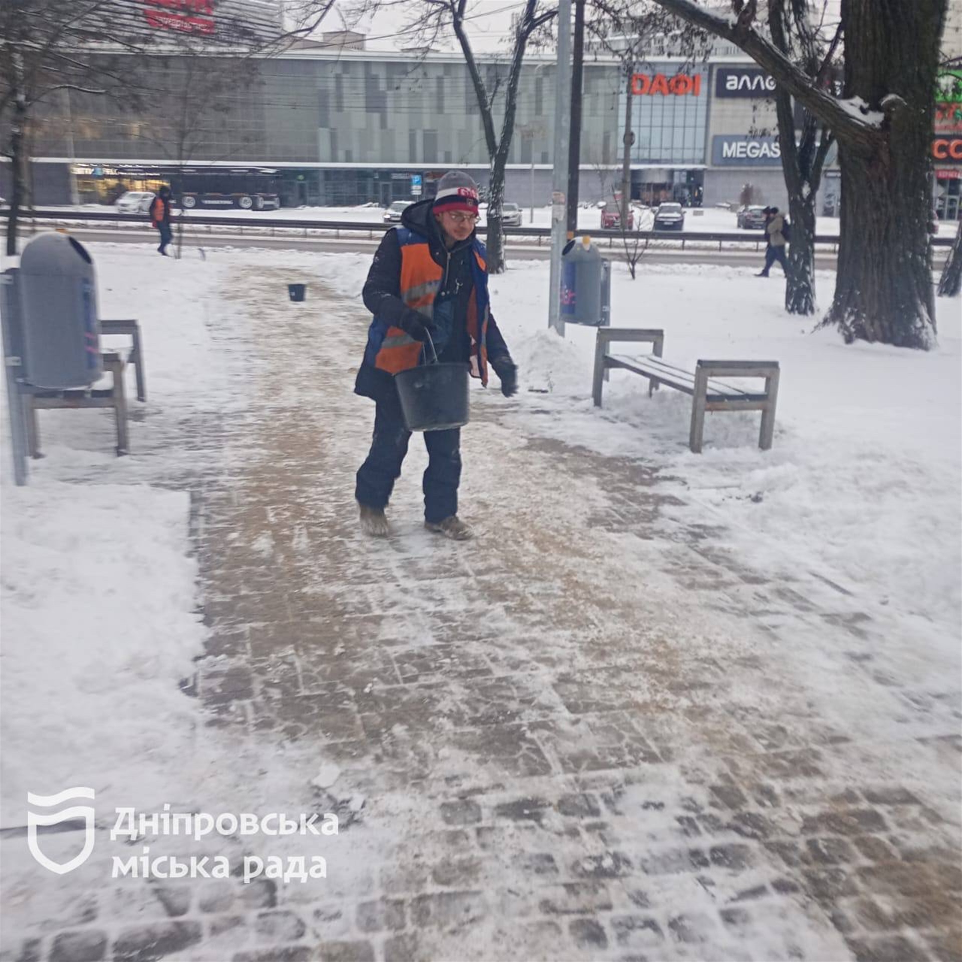 З вечора понеділка комунальні служби Дніпра прибирають сніг та обробляють дороги й тротуари протиожеледними матеріалами.