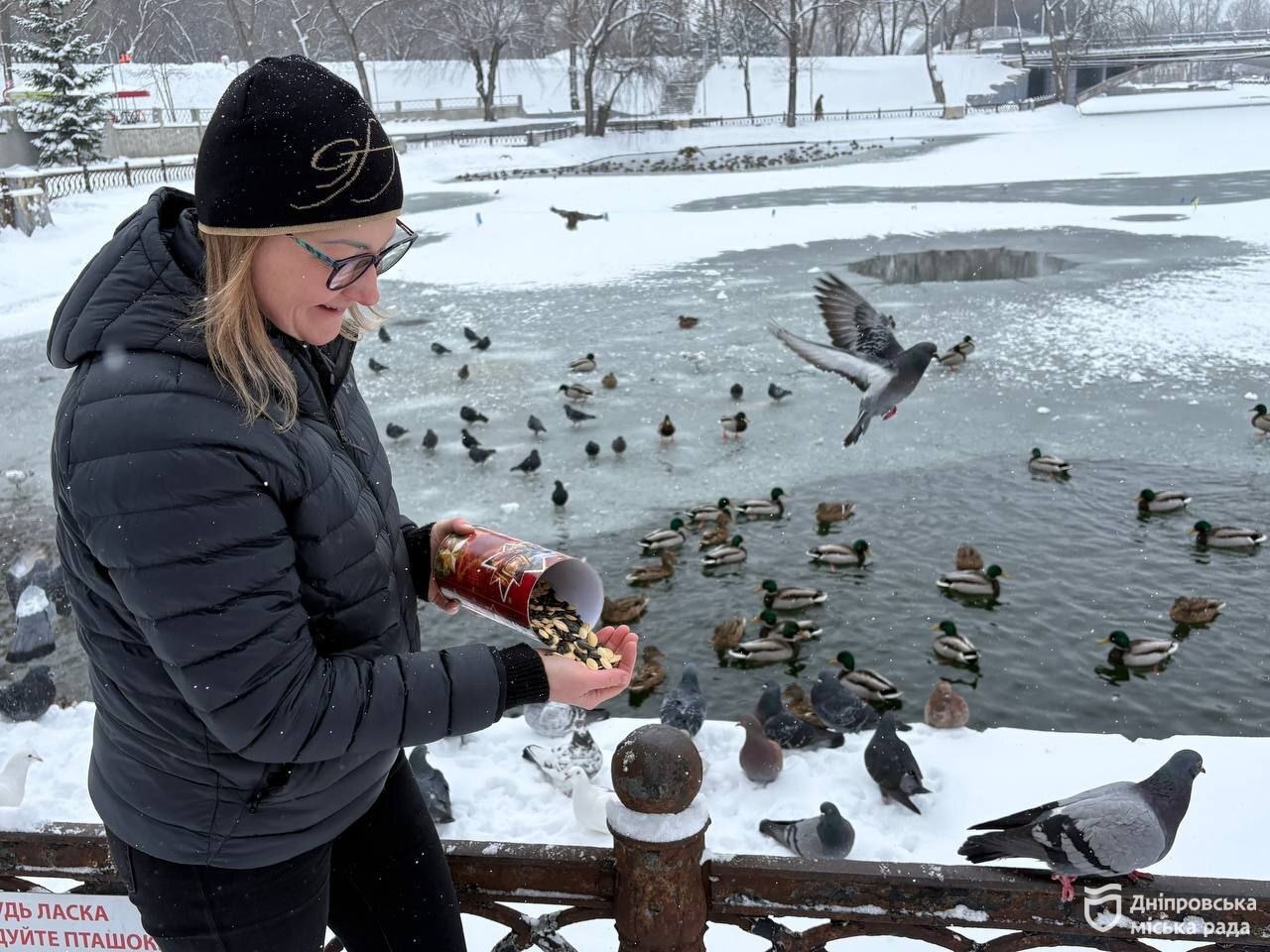 «У Дніпрі зараз справжня зима: морози, сніг вкрив парки, сквери й водойми. І це проблема для пухнастих мешканців та птахів, адже знайти їжу самостійно стає важче. Наполегливо просимо містян не кидати їжу в воду, а залишати її на березі. В жодному разі не можна годувати птахів випічкою. Вона дуже шкодить їхньому здоров’ю. Краще обирати зерно, а саме пшеницю, кукурудзу чи овес, подрібнені крупи, насіння чи сушені фрукти», — зазначила заступниця директора департаменту парків та рекреації Дніпровської міської ради Анастасія Петренчук. Вона 15 січня чергувала по місту.