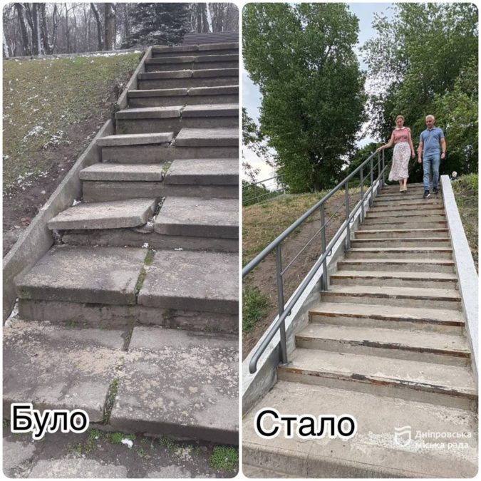 «Ці сходи роками були у поганому стані – тріщини, деформації, небезпечні перепади висот. Ми повністю демонтували пошкоджені елементи, залили нові монолітні сходи, облаштували пологий з’їзд та встановили поручні. Остаточне декоративне оздоблення залишимо на мирний час – головне зараз, щоби було безпечно і зручно для всіх», – коментує начальник технічного відділу КП «Міська інфраструктура» Дніпровської міськради Андрій Гаркавенко.