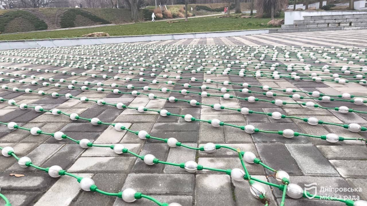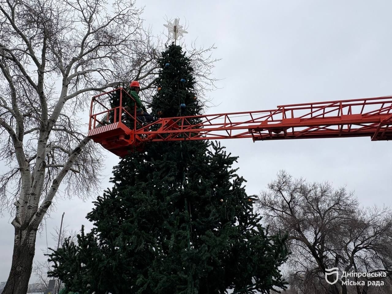 Парки та сквери Дніпра готують до різдвяних свят. Там встановлюють новорічні ялинки, вішають гірлянди. Новорічну красуню вже встановили у сквері Західний. Зараз комунальники збирають ялинку у парку Шевченка.