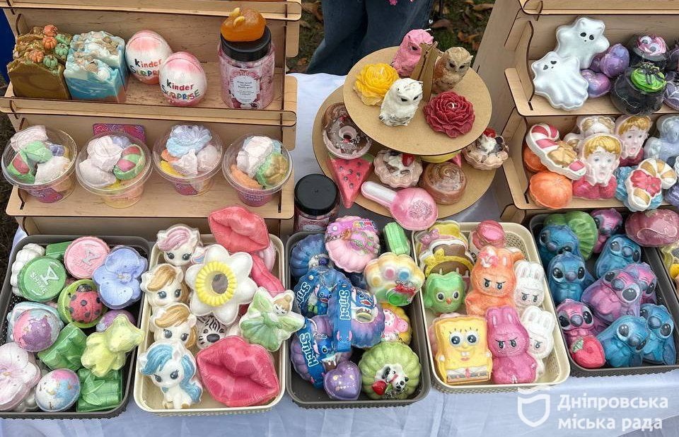 «У мене дуже великий асортимент мила та бомбочок. Зазвичай до кожного свята чи події можна підібрати якісь види продукції. Тут і для дітей, і для дорослих аромати, і до Гелловіну, і зимові персонажі. Найбільше моя продукція подобається дітям, адже це яскраво, святково та дарує задоволення. А ще вони полюбляють аромати і коли в ванні багато гарної піни та кольору. Наступні мої клієнти – це жінки, які хочуть собі зробити приємний подарунок чи своїм близьким. Вони досить прискіпливо обирають, я завжди допомагаю, і ми разом підбираємо», – розповідає продавчиня Ірина.