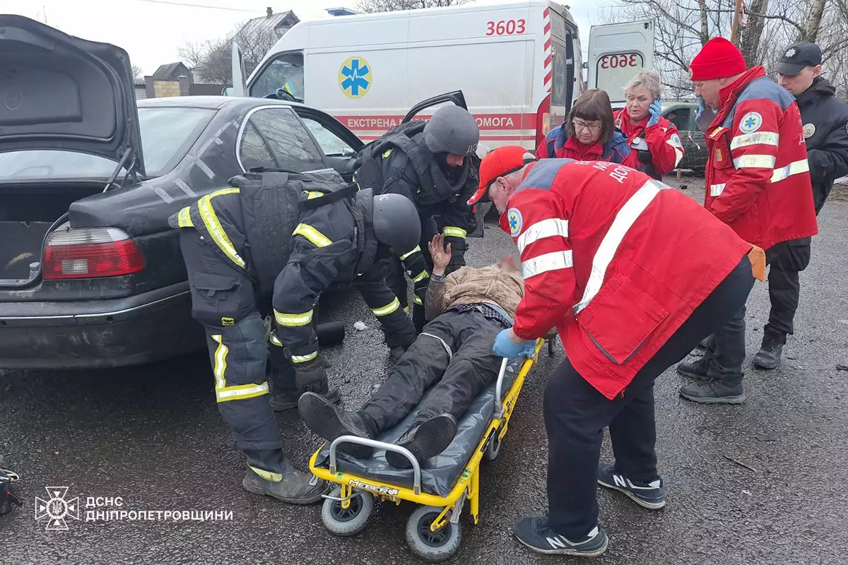 Травмованого чоловіка з автомобіля «BMW» рятувальники обережно перенесли до автомобіля екстреної медичної допомоги для подальшої госпіталізації.