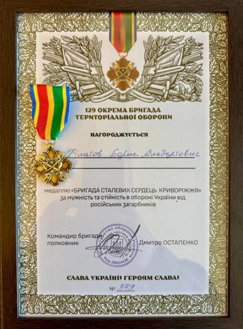 “Дорогі дніпряни, сьогодні всіх нас нагородили медаллю “Сталевих сердець” від 129-ї криворізької бригади ТрО. Бо хлопці й дівчата нам теж рідні. І з Кривим Рогом ми так само поділяємо біль і спільне прагнення помститися тим, хто нам його завдає”, — написав очільник міста.