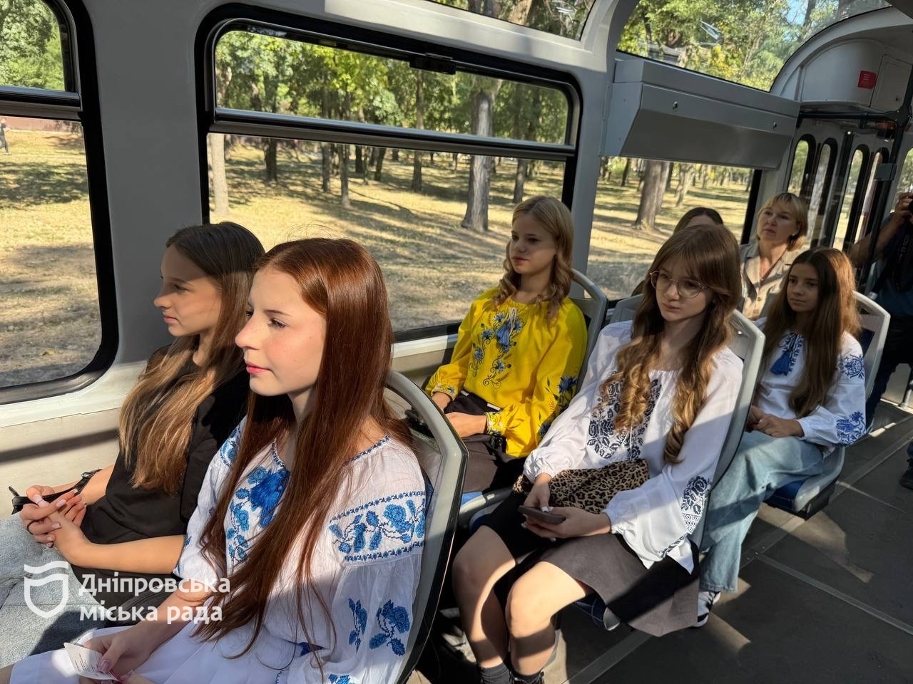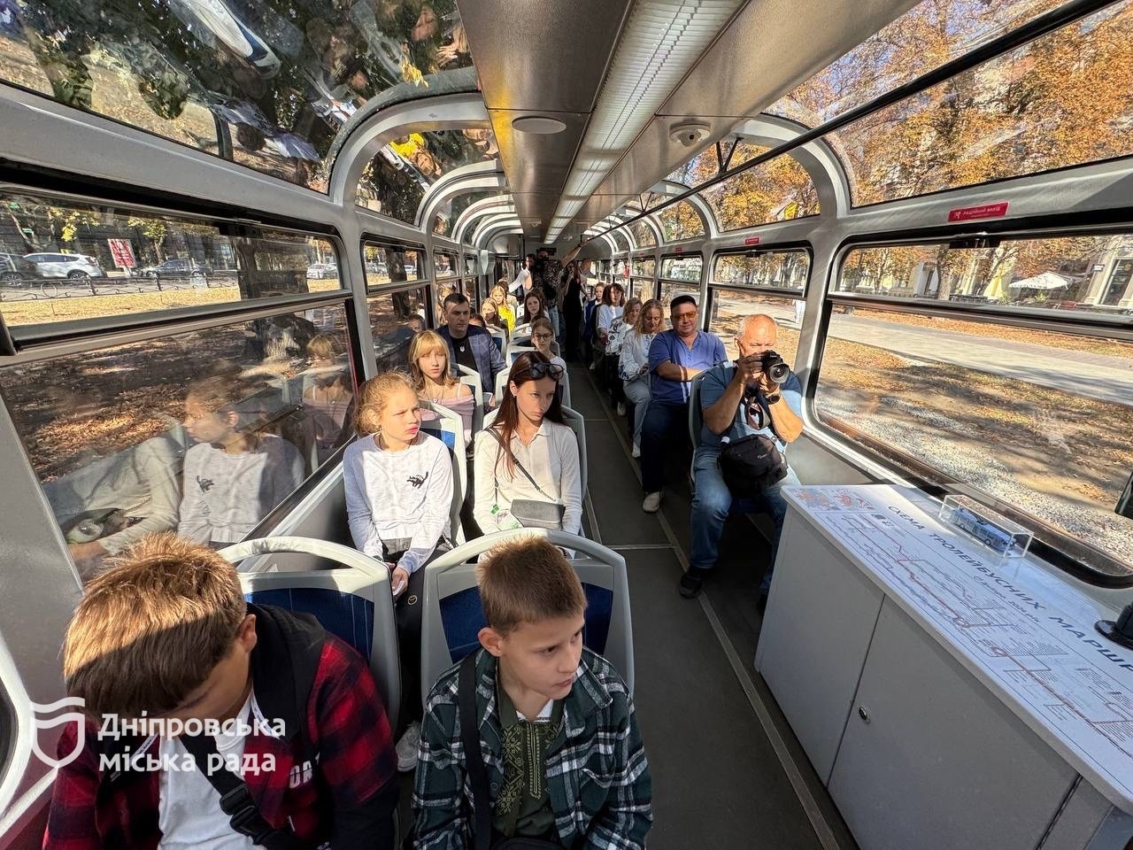 «Два панорамні вагони надійшли до Дніпра торік з Лейпцига. Загалом тоді наше місто отримало 26 вагонів. У панорамних вагонах є все для комфорту і приємного відпочинку пасажирів: столики між сидіннями, аудіосистеми, обладнання для відображення візуального контенту, кондиціонування. Для екскурсійних вагонів розроблено індивідуальний варіант оформлення, не відходячи від дизайн-коду нашого міста. Гранатовий колір, біла хвиля та зображення видатних діячів міста. Ці панорамні трамваї адаптували під наші колії. Сьогодні була перша екскурсія для дітей полеглих захисників », — сказав заступник міського голови Ігор Маковцев. Він 13 вересня чергує містом.