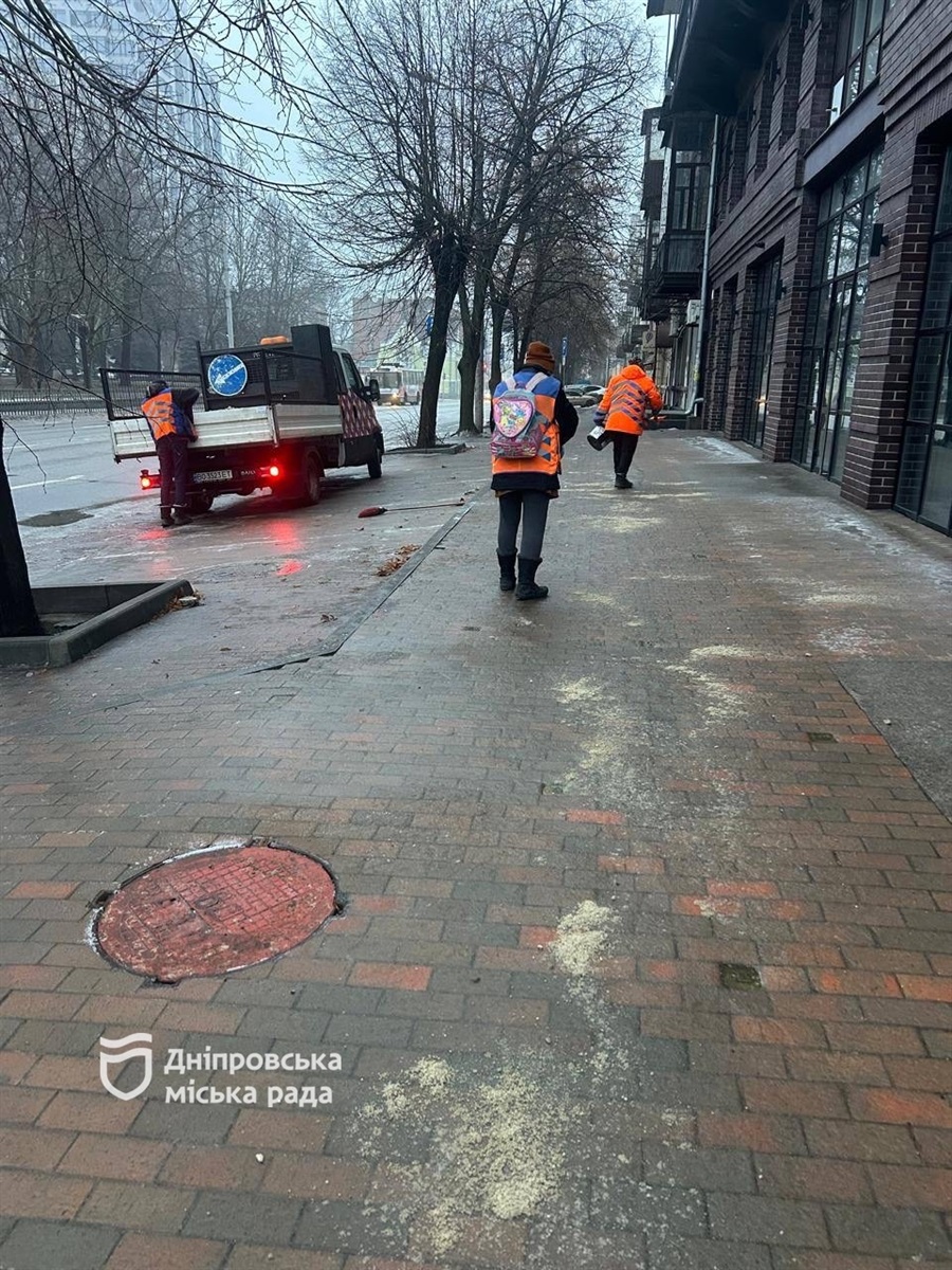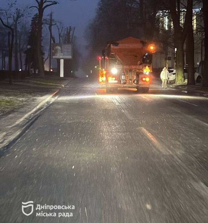 У Дніпрі з ночі комунальники борються з ожеледицею. Станом на 07:00 до робіт залучено 55 піскорозкидачів, 7 навантажувачів, 12 одиниць мінітехніки та близько 400 прибиральників. Для обробки дорожнього покриття використано 621 тонну протиожеледного матеріалу.