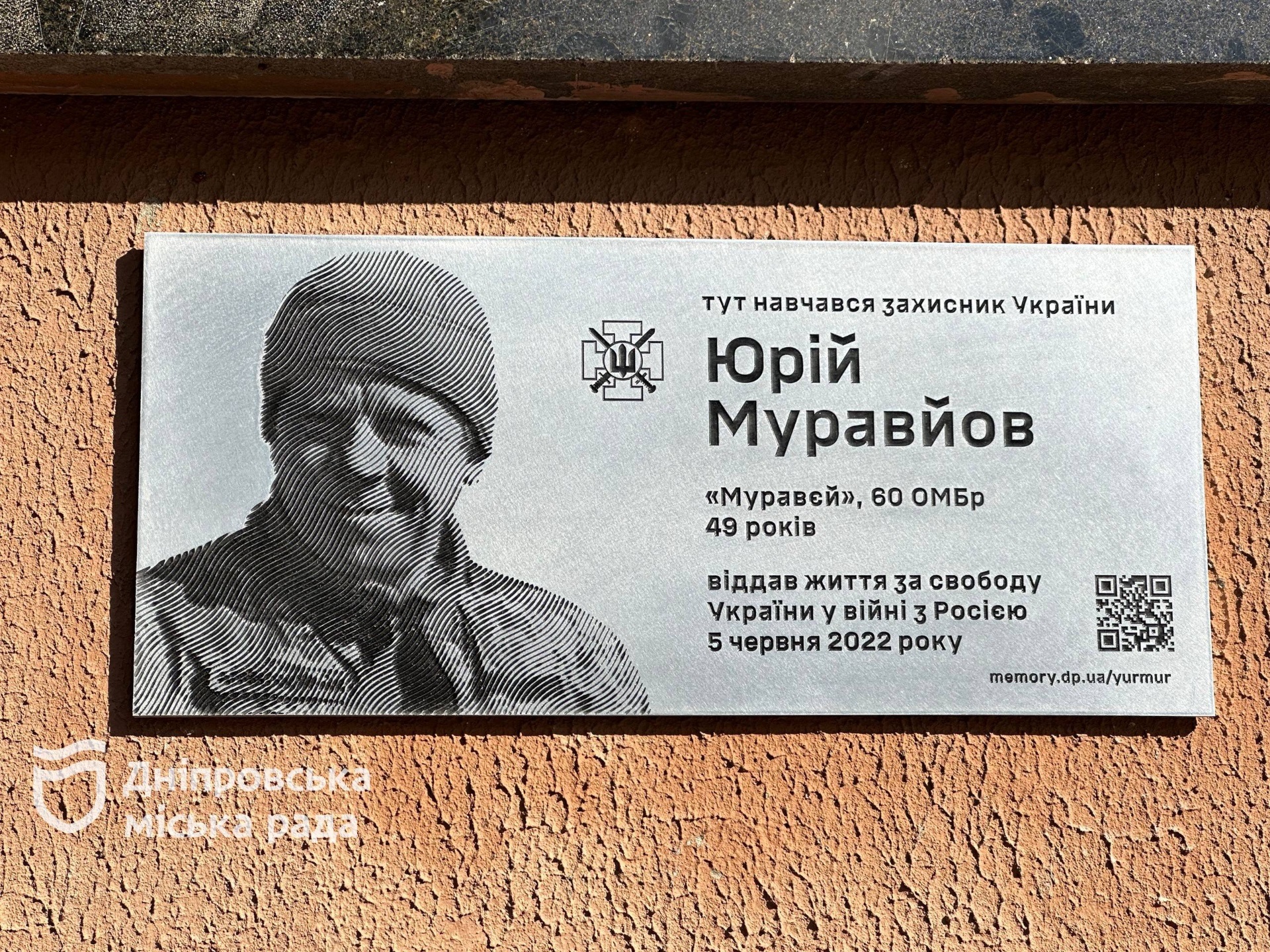 Меморіальна дошка Юрію Муравйову — одне з нагадувань про ціну миру у Дніпрі. Місто продовжує встановлювати подібні пам’ятні знаки на школах, де навчалися захисники.