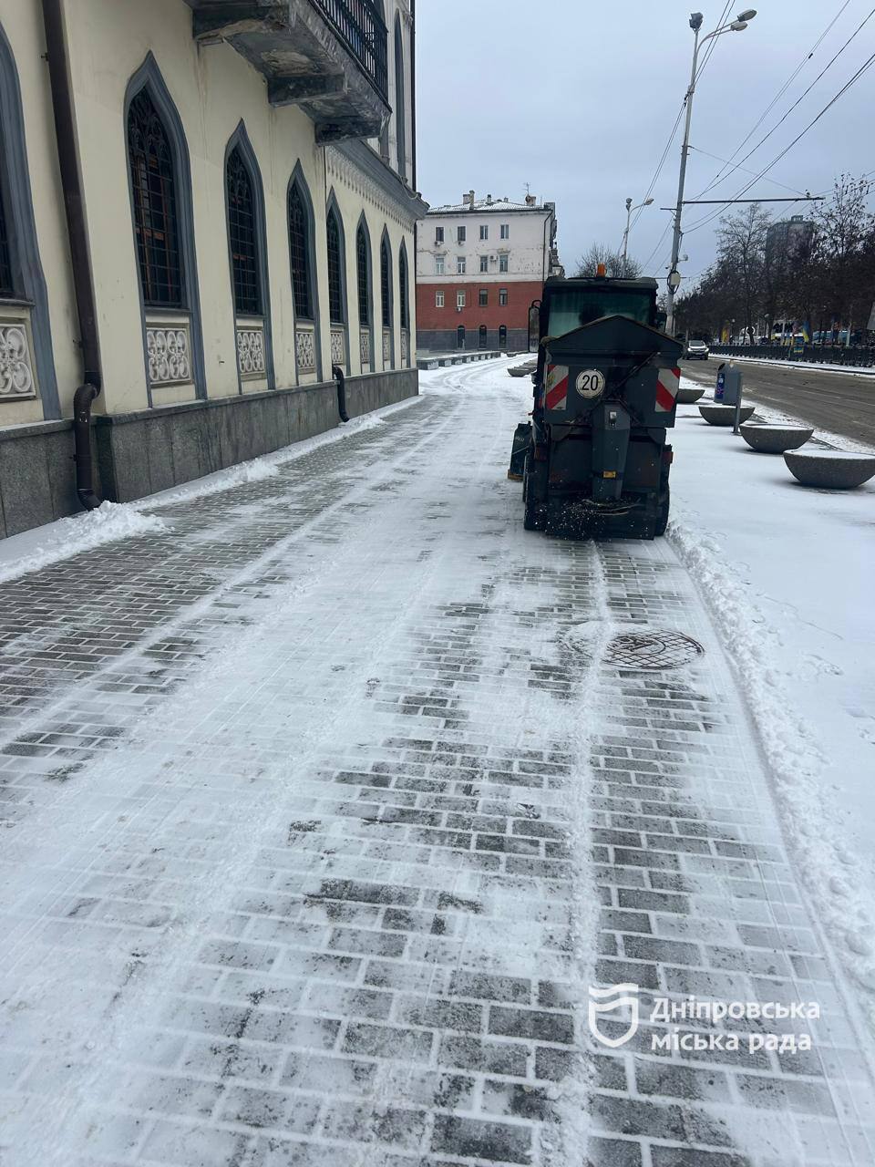 У Дніпрі спецтехніка зночі почала працювати на міських дорогах, щоб забезпечити безпеку дорожнього руху та пішоходів.