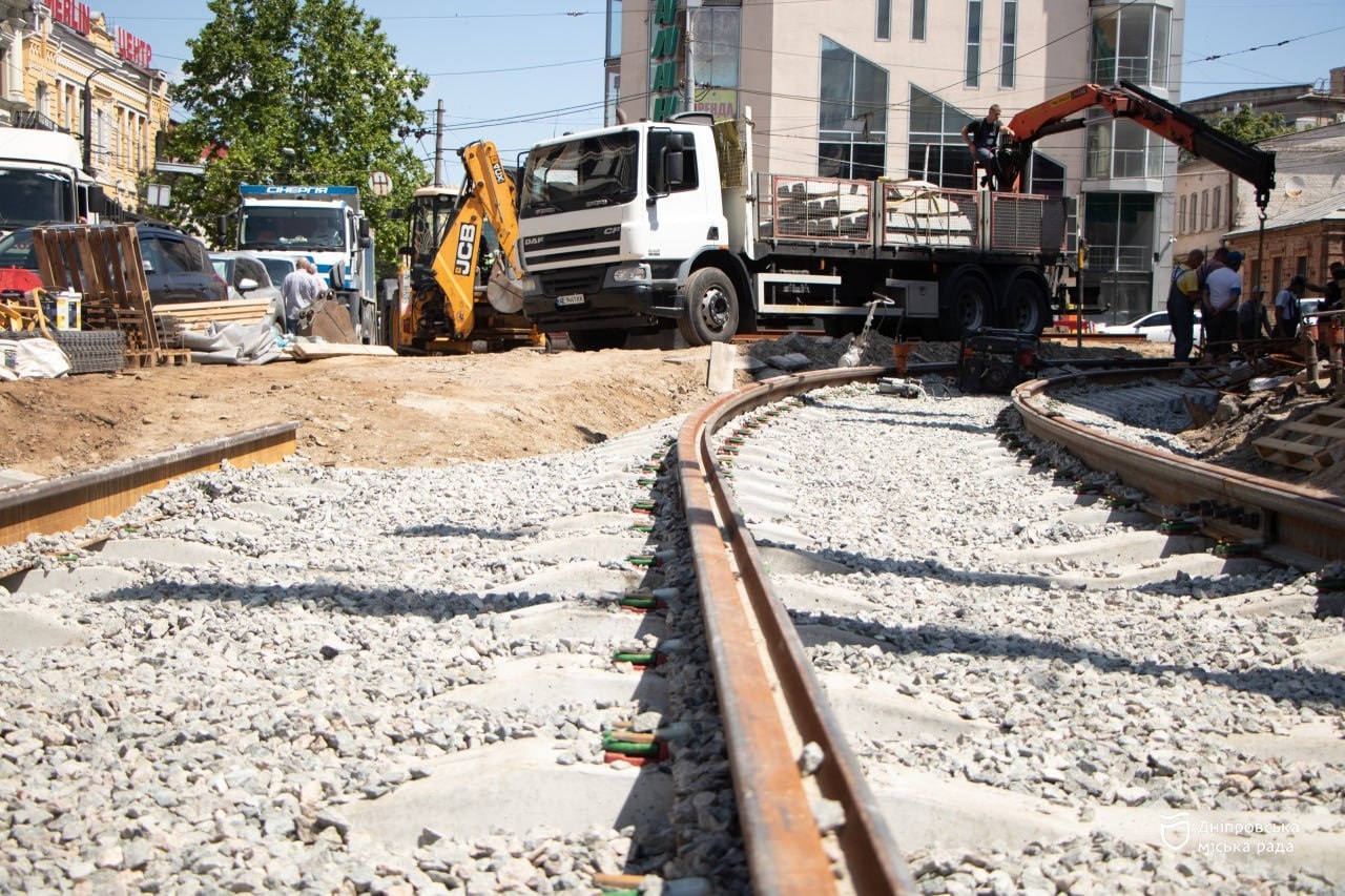 Саме такою у Дніпрі тепер стала ділянка руху на перехресті просп. Дмитра Яворницького – вул. Короленка – вул. Володимира Мономаха. Колію улаштували у широкосмугові залізобетонні плити, всього їх 118 в обох напрямках.