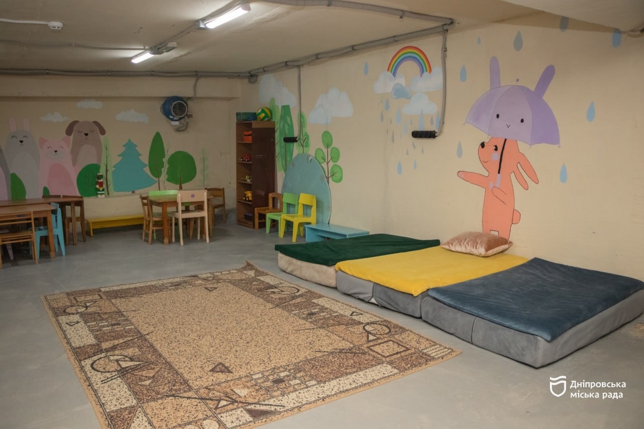 «На місці підвального приміщення нам облаштували просторе укриття. Перед цим замінили всі п’ять каналізаційних вводів, що зробило приміщення безпечним. Укриття розраховане на 200 дітей, зараз у нас виховується 82. Є як звичайні групи, так і групи для дітей із затримкою психічного розвитку та з порушеннями зору. Для таких малюків очне навчання особливо важливе. Діти сприйняли укриття як частину навчання і навіть як гру. Тут вони можуть танцювати, гратися, навчатися, за потреби обідати. Є спальні місця, туалет, медична та ігрова кімнати», – зазначила директорка КЗДО № 375 Дніпровської міської ради Галина Кучеренко.