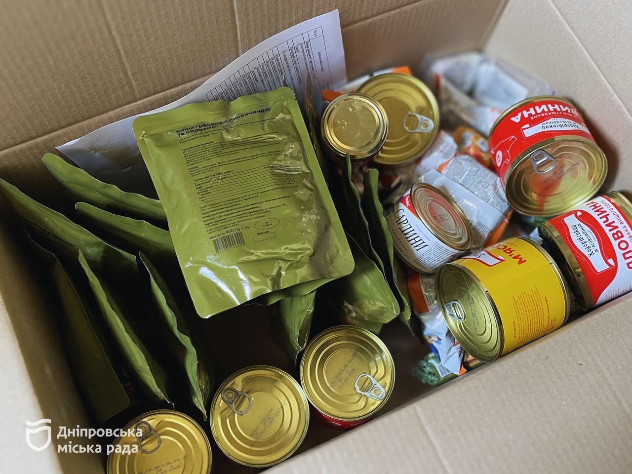 У Дніпрі вимушені переселенці продовжують щомісяця отримувати безкоштовні набори продуктів харчування. Придбані вони коштом міського бюджету. Серед іншого, у них — тушковане м’ясо, каші, галети, вермішель швидкого приготування, чай, кава тощо.