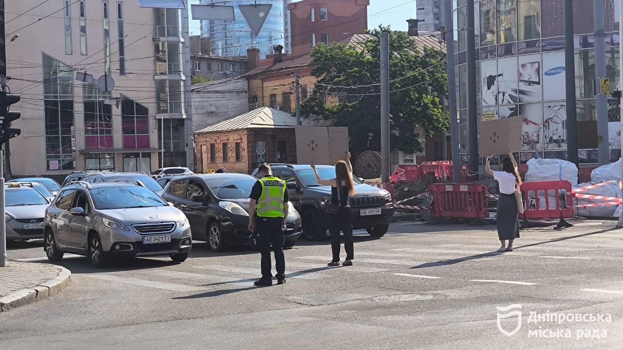 Разом з поліцією учасники акції на хвилину перекрили дорогу на перехресті проспекту Яворницького та вулиці Володимира Мономаха.
