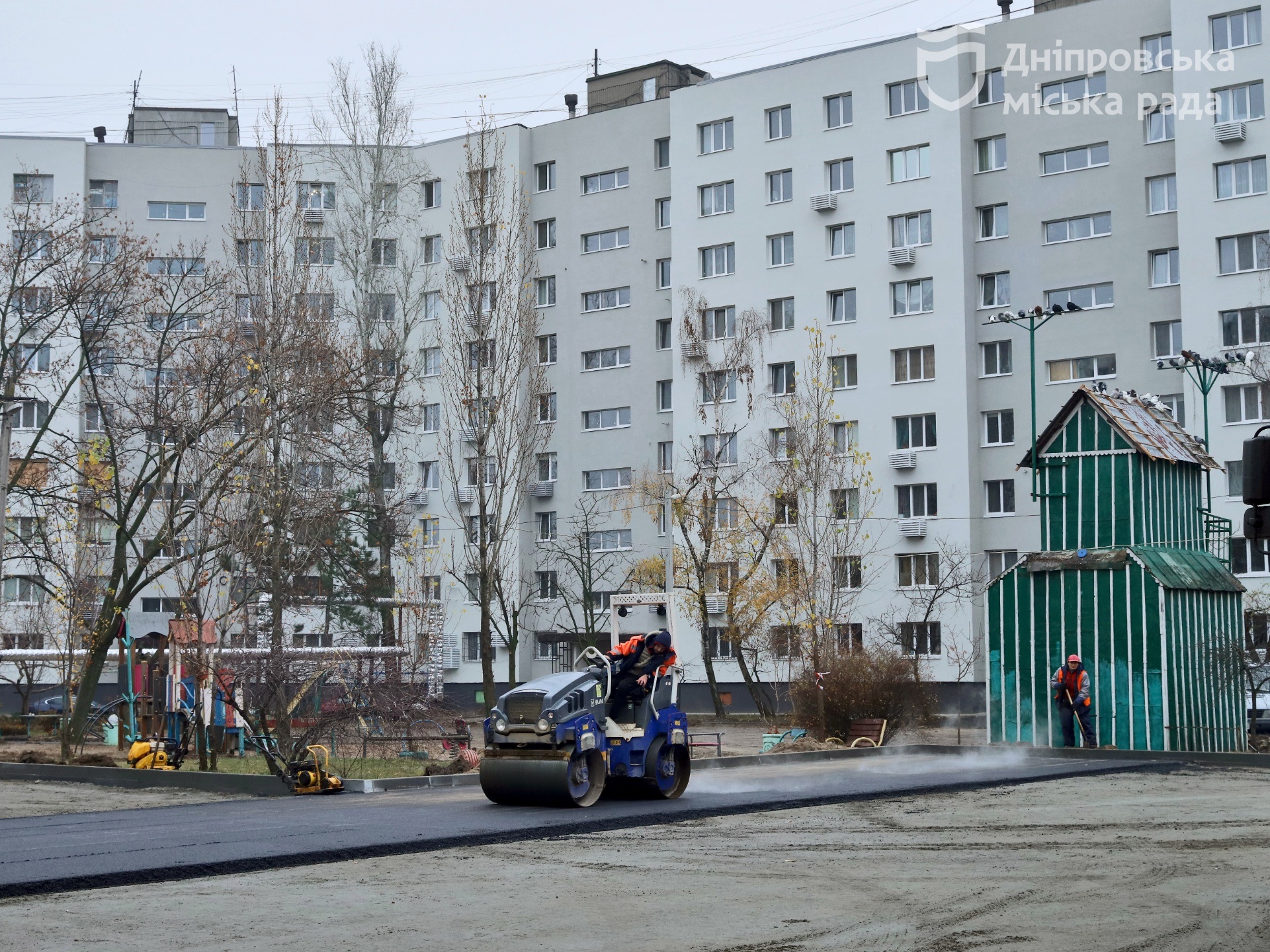 Нині ремонтники вже перейшли до вкладання асфальту. До цього у дворі зробили всі необхідні заниження бордюрів — щоб простір став зручним та безбарʼєрним.
