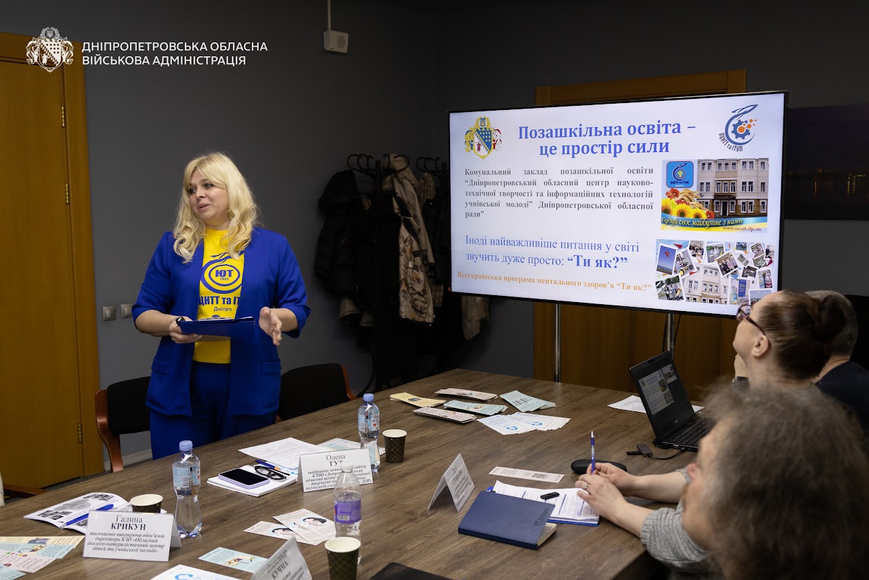 На зустріч зібралися заступник начальника Дніпропетровської ОВА Ірина Грицай, регіональна координаторка всеукраїнської програми ментального здоров’я «Ти як?» Вікторія Назаренко та очільники закладів позашкільної освіти.