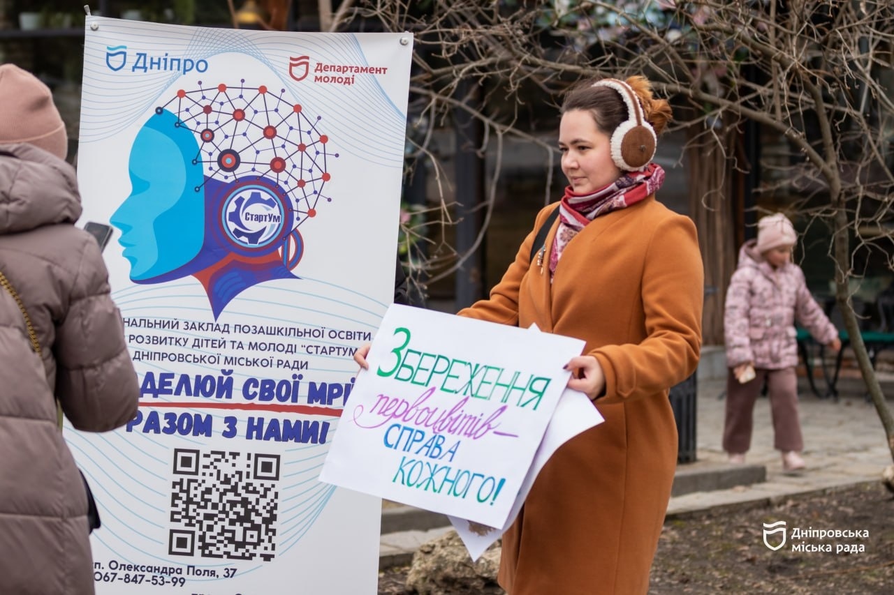 У Дніпрі в парку Шевченка провели екологічну акцію «Охорона та збереження первоцвітів – справа кожного!». Її учасники виготовили близько 600 символічних квіток із гофрованого паперу (крокуси та проліски) і дарували мешканцям міста. Так діти привертали увагу до проблеми знищення ранньоквітучих рослин і закликали містян не купувати їх.