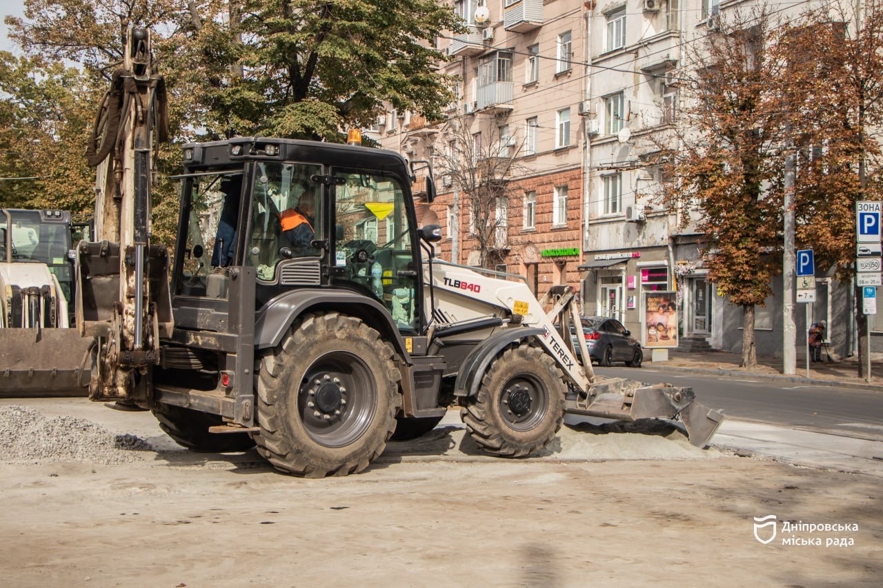 Паралельно працівники служби колії працюють на перетині проспекту Дмитра Яворницького та вулиці Мостової.