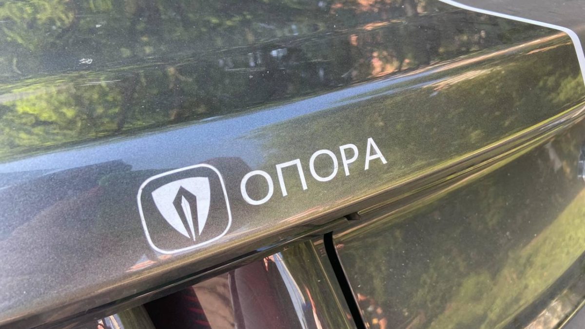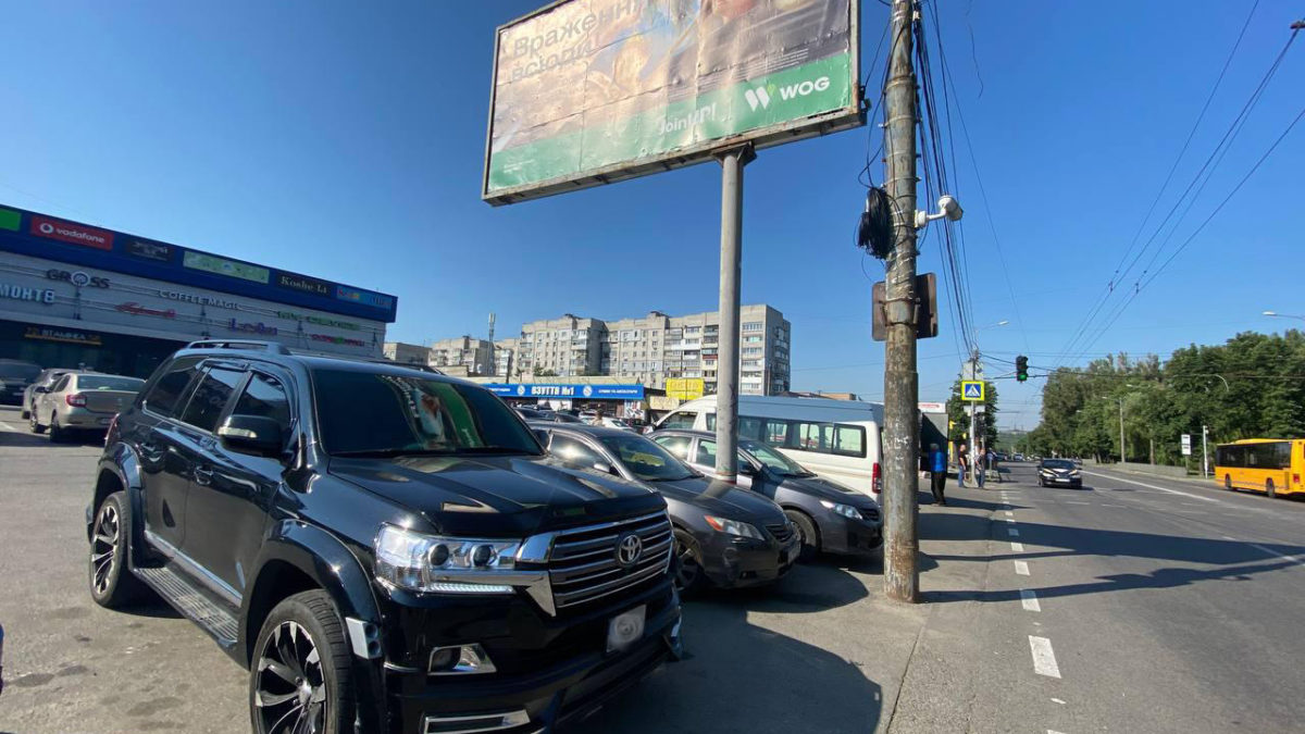 На перехресті вулиці Космічної та Запорізького шосе під білбордом стоїть Форд Мустанг. На автівці наліпка громадської організації «Опора», яку пов’язують з політичною партією Загіда Краснова.