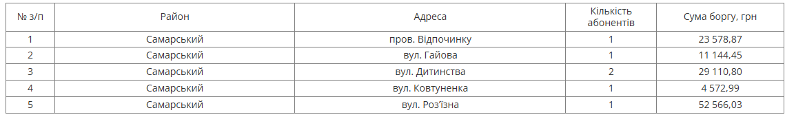 Крім того, з 23 по 27 червня КП «Дніпроводоканал» ДМР проводитиме планові відключення централізованого водопостачання в приватному секторі Самарського районі міста. Заборгованість мешканців перед підприємством за даними адресами становить 120 973,14 грн.: