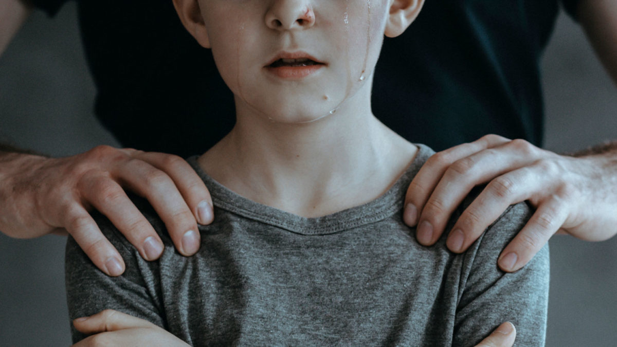 Close-up of man’s hands on a boy’s arms. Concept of pedophilia.