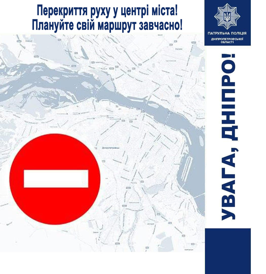 11 вересня, з 10:00 до 00:00, буде перекрито рух Січеславською Набережною від Державного цирку до Мерефо-Херсонського мосту; вулицею Ливарною; вулицею Поля; узвозом Крутогірним; вулицею Павла Нірінберга від вулиці Ламаної до Січеславської Набережної;