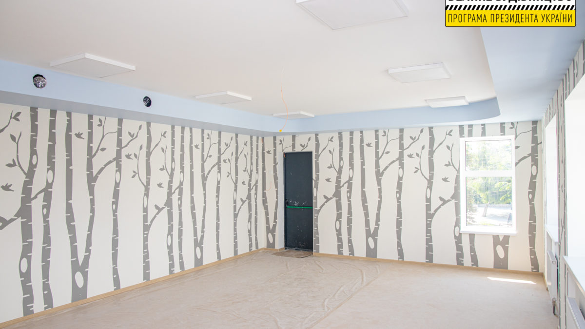Майже готовий другий поверх. У адміністративних кабінетах та дитячих кімнатах роботи вже завершили. Підрядникам лишилось зробити стелю у коридорі та вдруге пофарбувати стіни. Готова і велика зала для занять фізкультурою та музикою. Стелю обшили спеціальним гіпсокартоном – для кращої акустики.