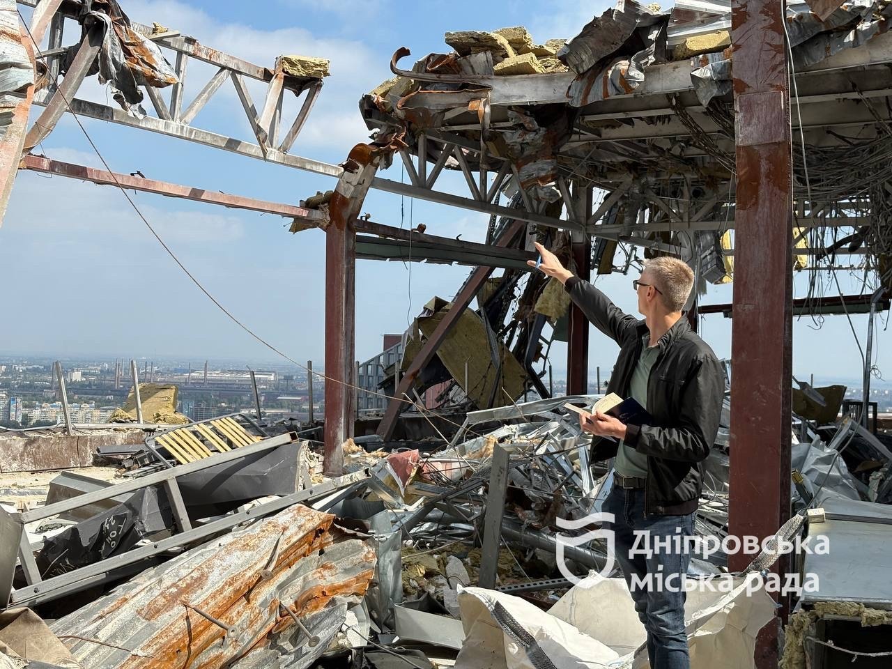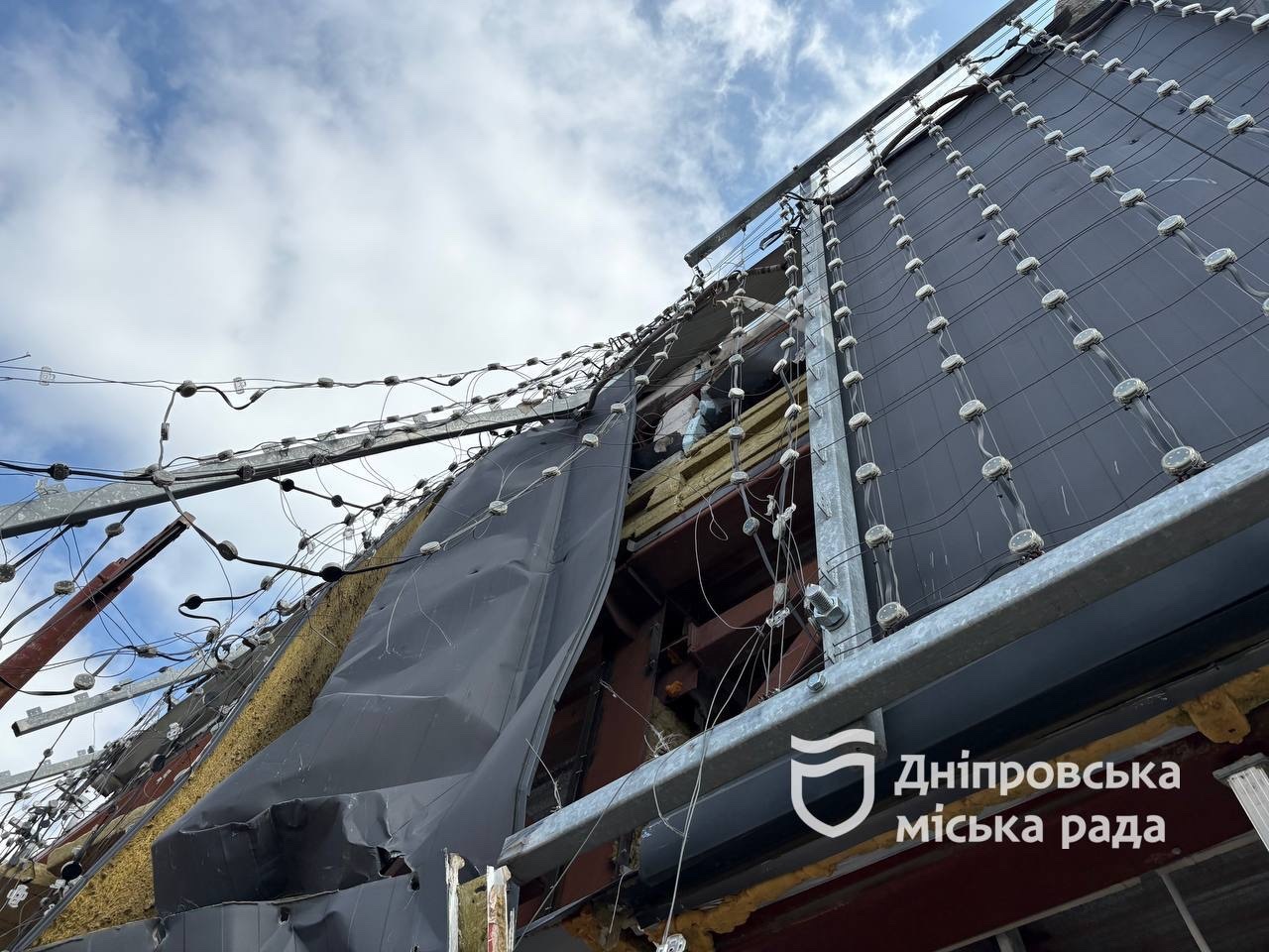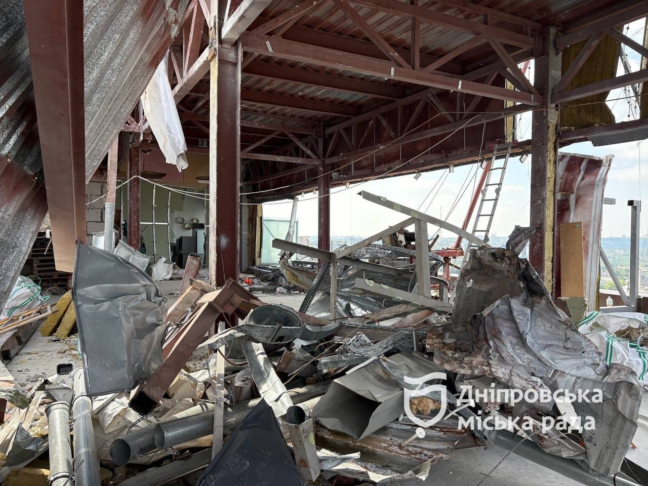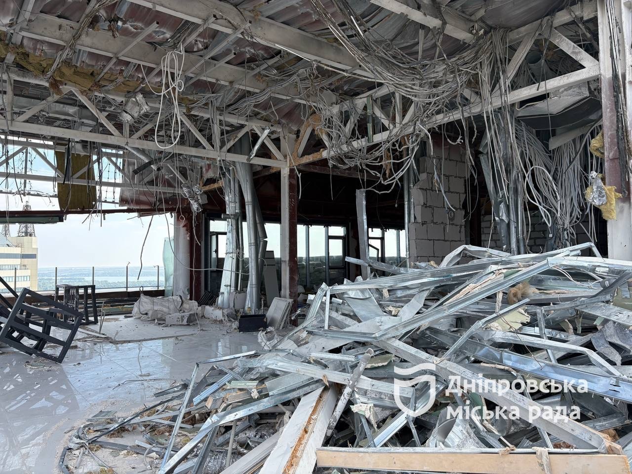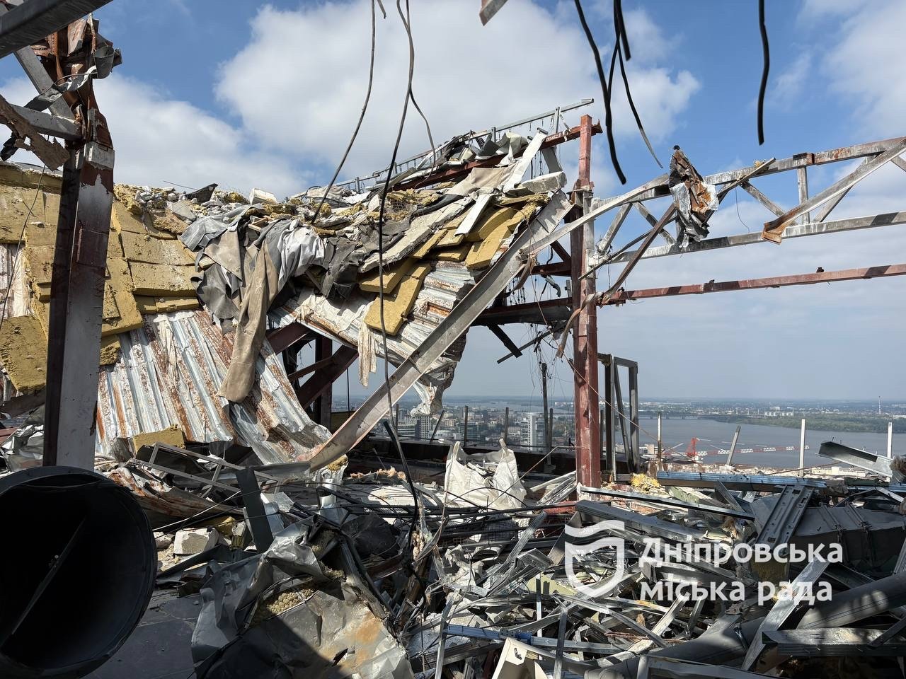 Пошкоджено покрівлю, ліфтове обладнання, несучі конструкції 25-го поверху та вибито вікна. Відновлювальні роботи в будинку тривають і досі. Їх виконання перевірив директор департаменту з питань самоорганізації населення Дніпровської міськради Святослава Ткаченко. Він 6 вересня чергував містом.